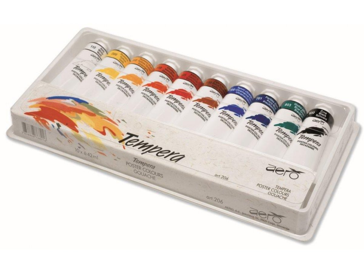 Briljantne i sjajne boje Aero tempera dostupne su pojedinačno i u setu od 10 komada. Dostupne su u 20 boja.