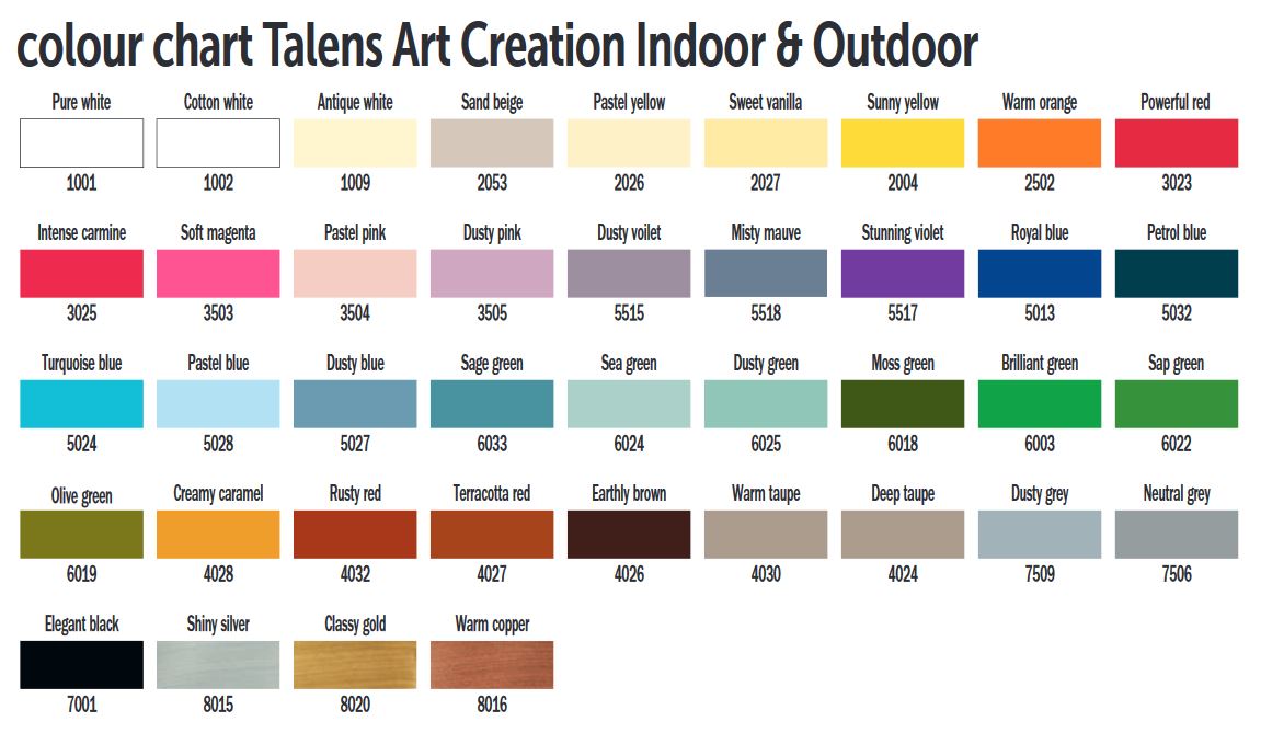 Talens Art Creation Indoor & Outdoor univerzalna je akrilna boja za unutarnju i vanjsku primjenu na svim podlogama. Ova satenska boja dostupna je u širokom rasponu od 40 boja uključujući jarke, pastelne i vintage boje. Nakon sušenja od 24 sata, boja je vodootporna i može se staviti van ako ste dekorirali tegle za cvijeće ili kućicu za ptice. Boje su proizvedene u Danskoj.