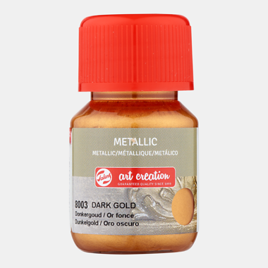 Talens Art Creation Metallic brzosušeća je boja s vremenom sušenja od cca.10 minuta. Ova boja odlična je za detalje i lako se nanosi na sve podloge dajući im sjajni trendi metalni sjaj. Prilikom rada s metalnom bojom važno je dobro očistiti površinu prije nanošenja boje kistom. Nakon sušenja, Metallic je vodootporan. Dostupan je u 12 metalnih nijansi. Boje su proizvedene u Danskoj.