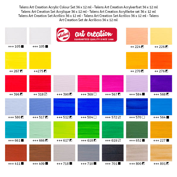 Talents Art Creation je pouzdana kvaliteta akrilnih boja koja se temelji 100% na akrilnoj smoli. Boja je pastozna, ima svilenkasti sjaj kada je suha i može se brzo preslikati. Kada se osuši, boja je vodootporna. Zbog svojih adhezivnih svojstava, ova boja omogućuje rad na bilo kojoj apsorbirajućoj nemasnoj podlozi bez prašine, kao što su platno i papir te žbuka, ploča, drvo, kamen i cement.