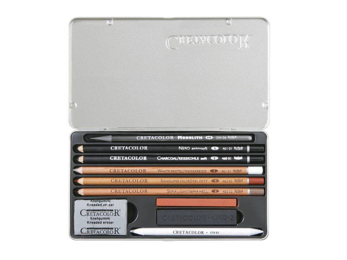 Osnovni set za crtanje i skiciranje (olovke: Monolith Graphite, Nero, ugljen olovka, bijela pastelna olovka, Sanguine uljana olovka, Sepia Light), Sanguine Burnt štapić, Sketching ugljen, papirnata brisalica i tjestasta gumica.