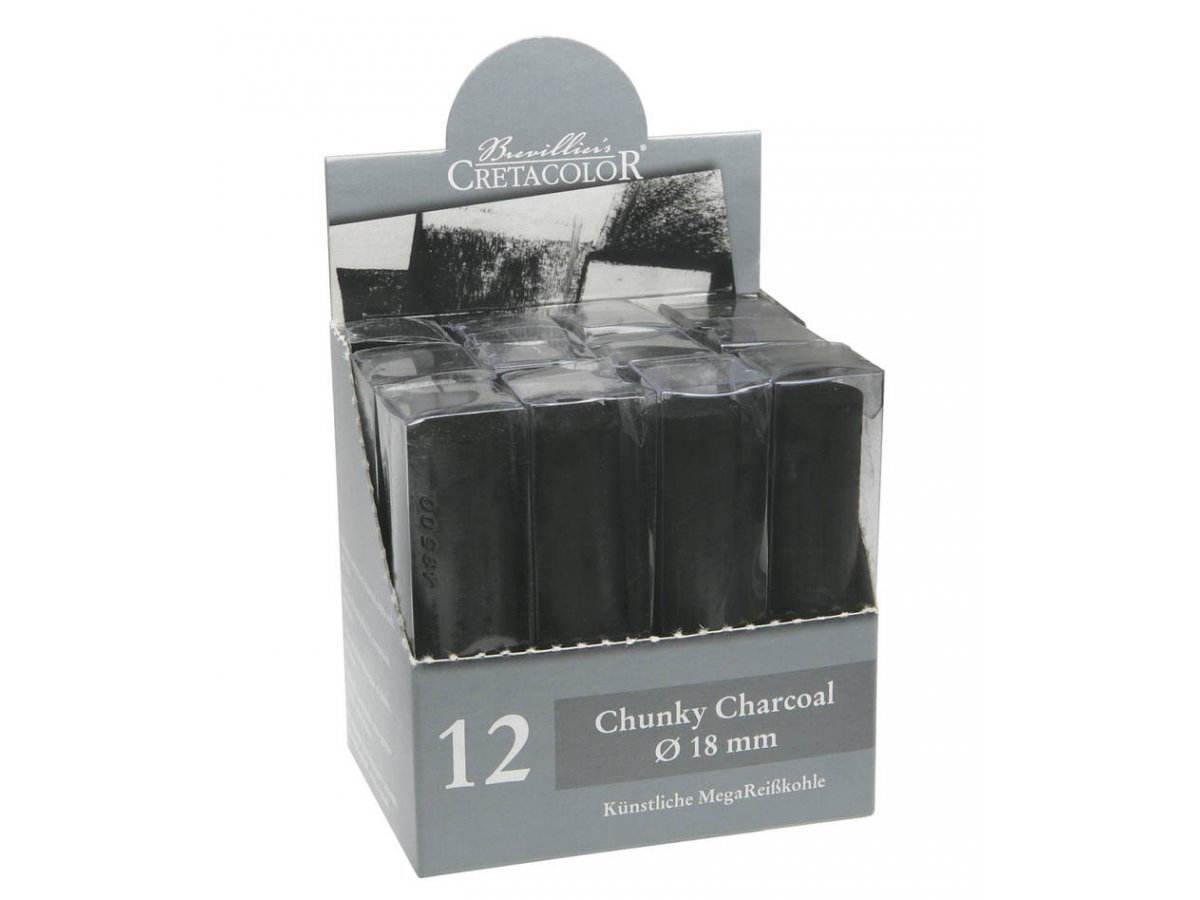 Chunky Charcoal je ekstra veliki, okrugli komad komprimiranog drvenog ugljena koji daje glatku, intenzivnu crnu boju izuzetne dubine i tonaliteta. Savršeno za velike crteže i skice. 18 mm promjera.