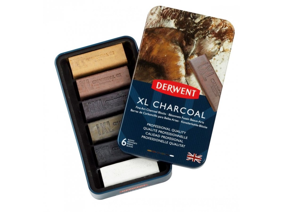 Derwent ugljen štapići dolaze u setu od 6 bogatih prirodnih boja i XL formatu (2x6 cm). Topivi su u vodi te ih možete koristiti na vlažnoj površini i za slojevito slikanje. Set sadrži nijanse: Ochre, Sanguine, Mars Violet, Sepia, Black, White.