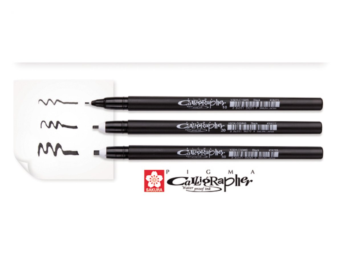 Pigma® Calligrapher™ je jedinstveni, sve-u-jednom, izdržljiv umjetnički alat za pisanje slova koji daje oštre rubove i tanke linije. Ovaj marker ima vrh od tvrdog najlona koji podnosi snažan pritisak i stalnu upotrebu, a još uvijek pruža pouzdan, gladak protok tinte od ruba do ruba. Pigma Calligrapher dizajniran je posebno za kaligrafe i pisce slova svih razina. Za razliku od većine kaligrafskih markera čiji se vrhovi troše korištenjem, što rezultira nedosljednim tragovima.