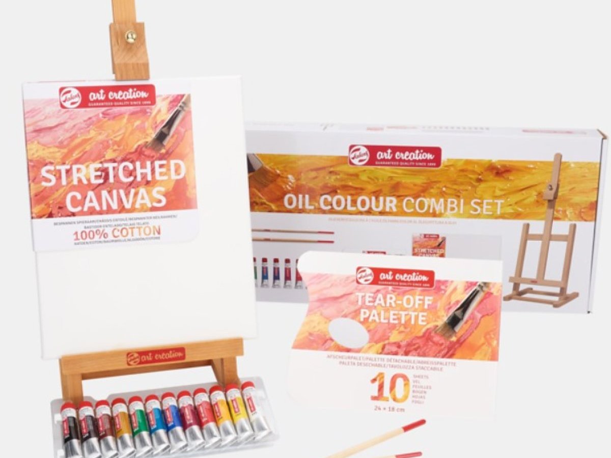 Combi set kutija sadrži 12x12 ml uljanih boja, dva kista, stolni štafelaj, napeto platno i papirnate palete.