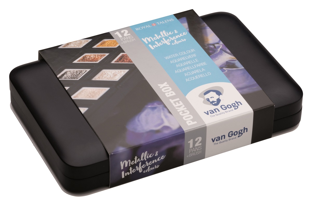 Van Gogh Pocket Box sadrži sve nove perlaste i metallic boje. Set uključuje 12 akvarel kocki i kist, a preporučamo da slikate na crnom Van Gogh akvarel papiru da bi boje došle do punog izražaja.