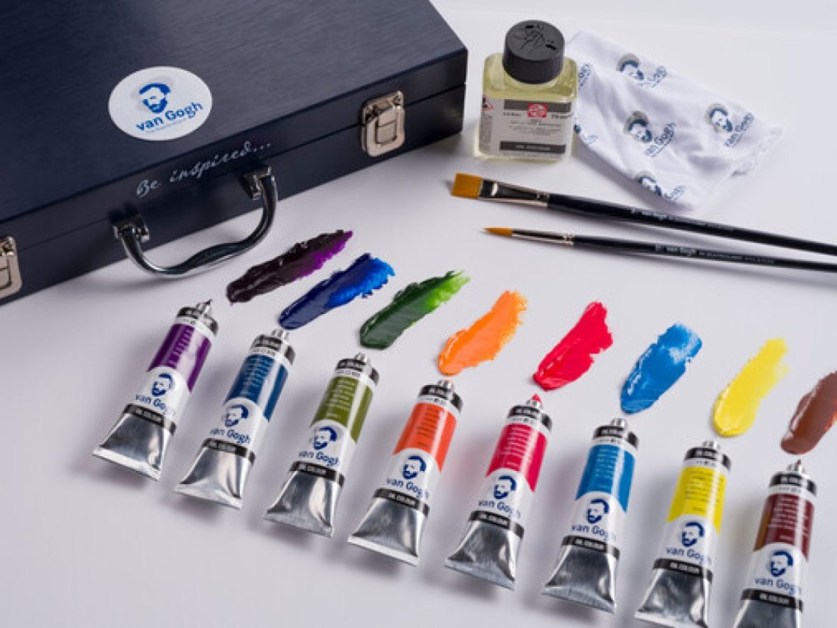 • 12 x 40 ml Van Gogh uljanih boja (104 Zinc White – 105 Titanium White – 267 Azo Yellow Lemon – 276 Azo Orange – 366 Quinacridone Rose – 372 Permanent Red – 536 Violet – 570 Phthalo Blue – 534 Cerulean Blue – 623 Sap Green – 411 Burnt Sienna – 701 Ivory Black)