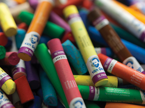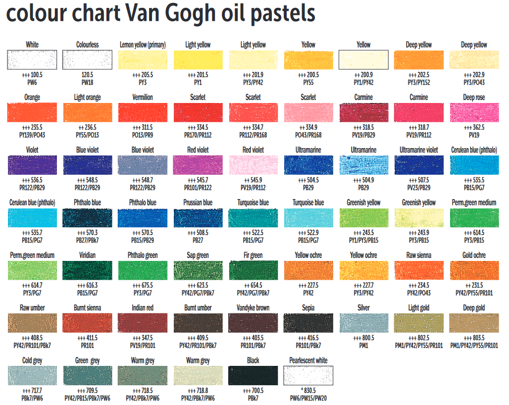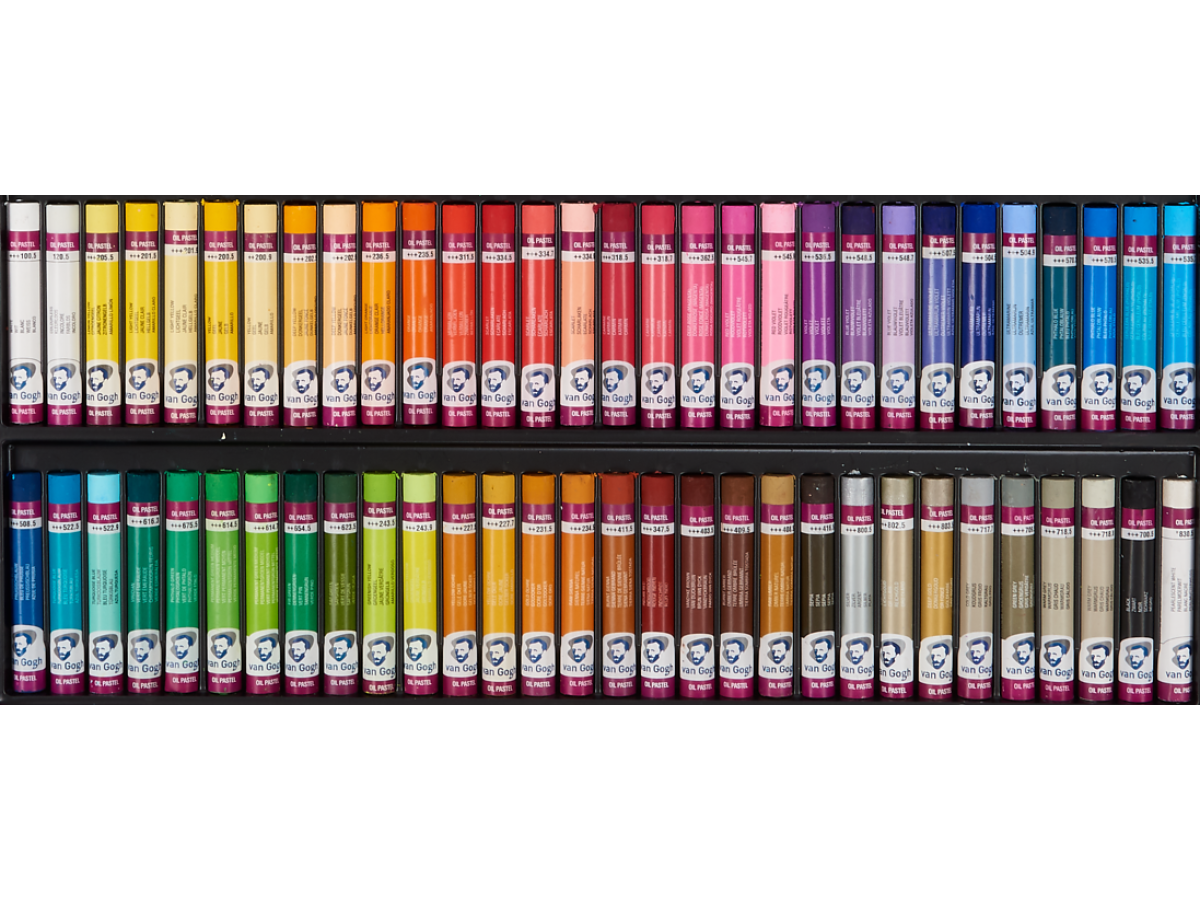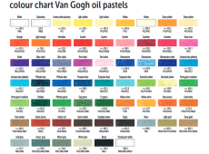 Van Gogh uljne pastele izrađene su od čistih pigmenata, mineralnih ulja i veziva voska za nevjerojatno meko i glatko postavljanje bez prašine. Imaju izvrsnu čvrstoću nijansiranja i lak prijenos boje te su prikladne za razne podloge. Cjelokupni asortiman sastoji se od 60 boja.